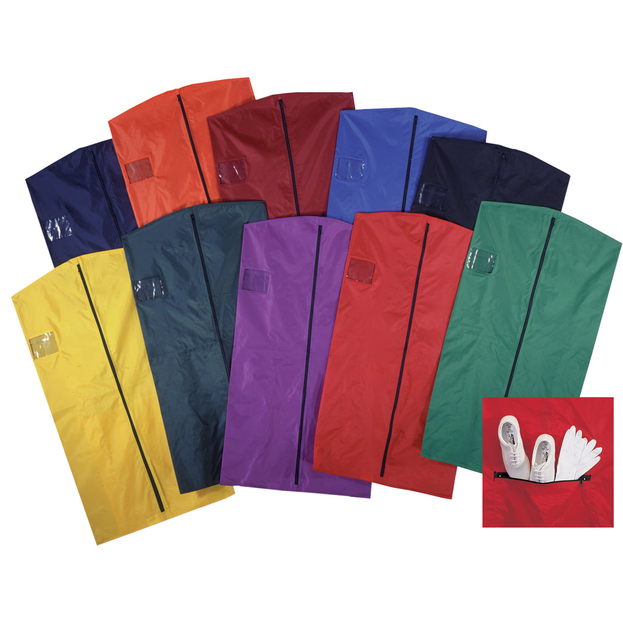 Poly-soft taffeta/polyester bags include clear ID window and convenient top opening for hanger.