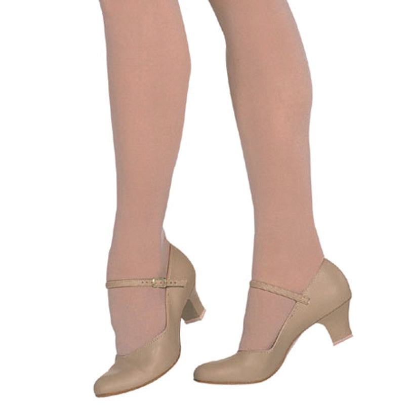 Stylish character shoe features a PU upper, 1.5" heel, and leather sole.