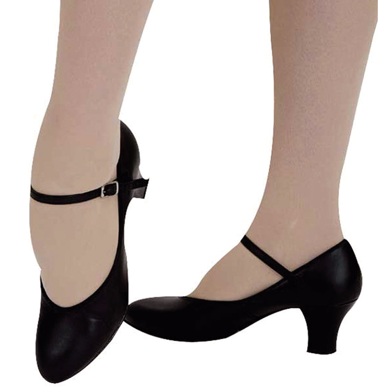 Stylish character shoe features a leather upper, 2" heel, and scored leather sole.