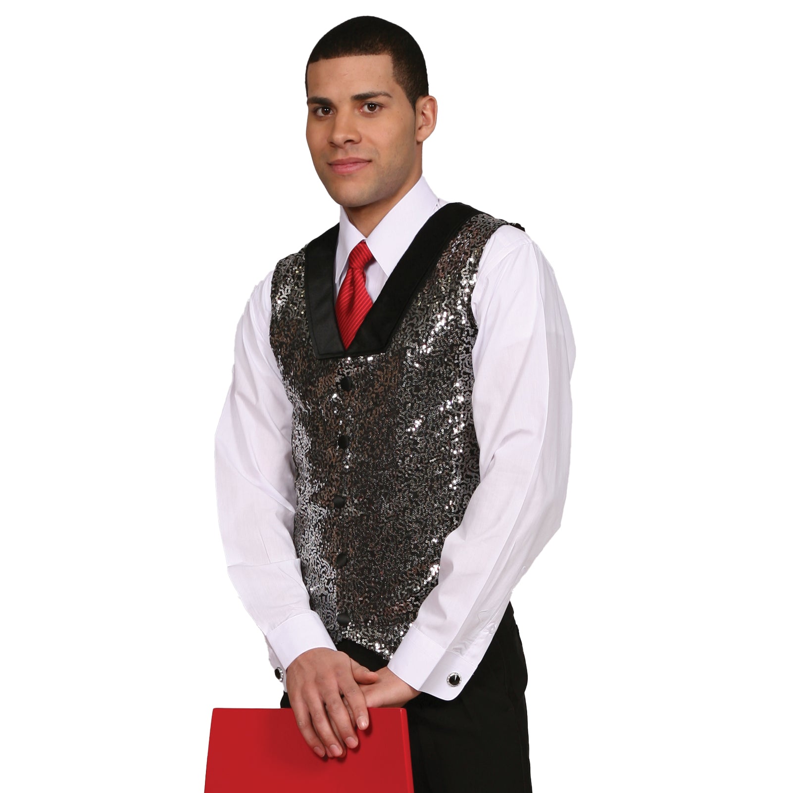 Sparkle Sequin vest with full back is accented with satin lapels and is fully lined. Sequin is front only. Satin buttons sold separately.