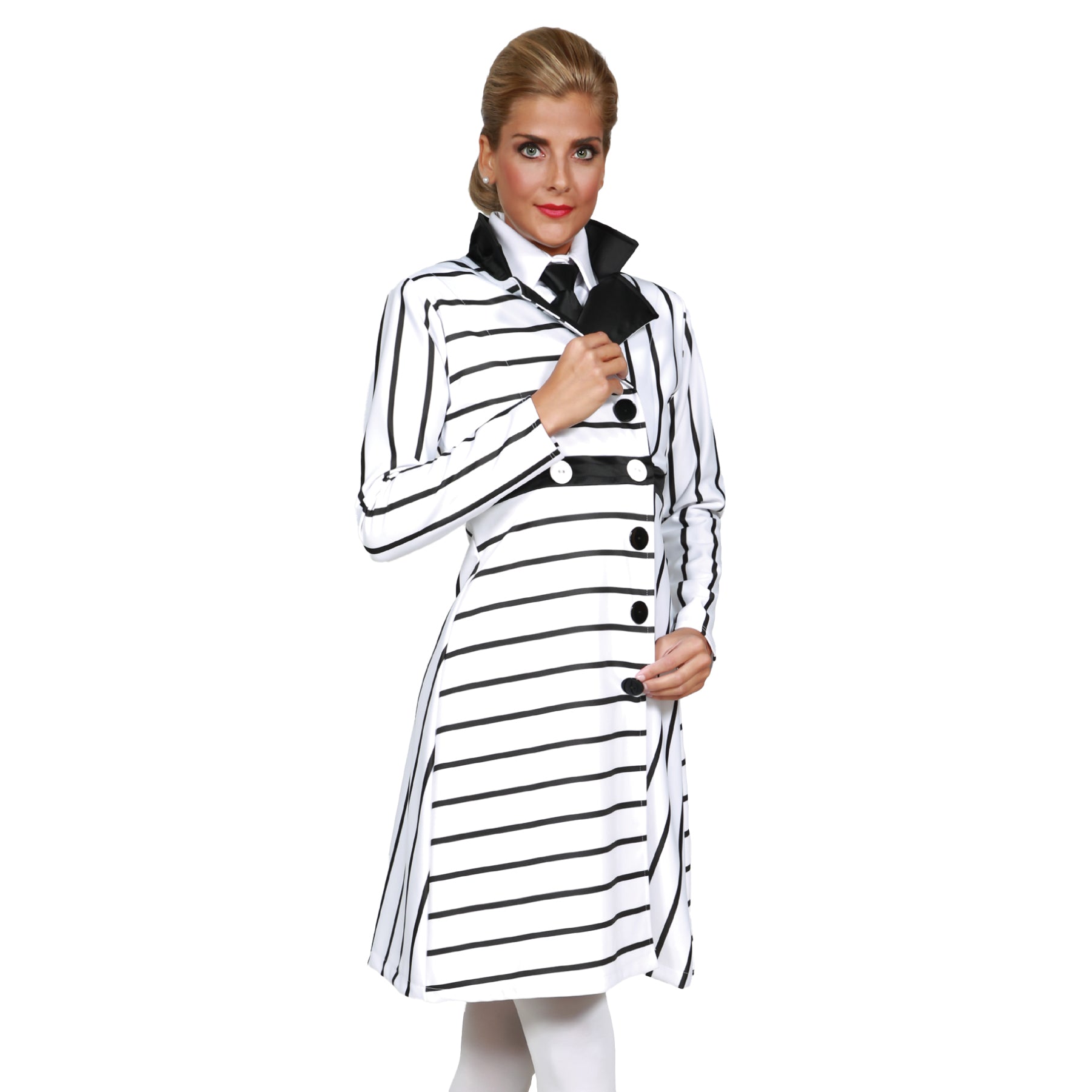 Knit long sleeve dress with side snap tearaway feature accented with button detail. Contrasting collar and waist.