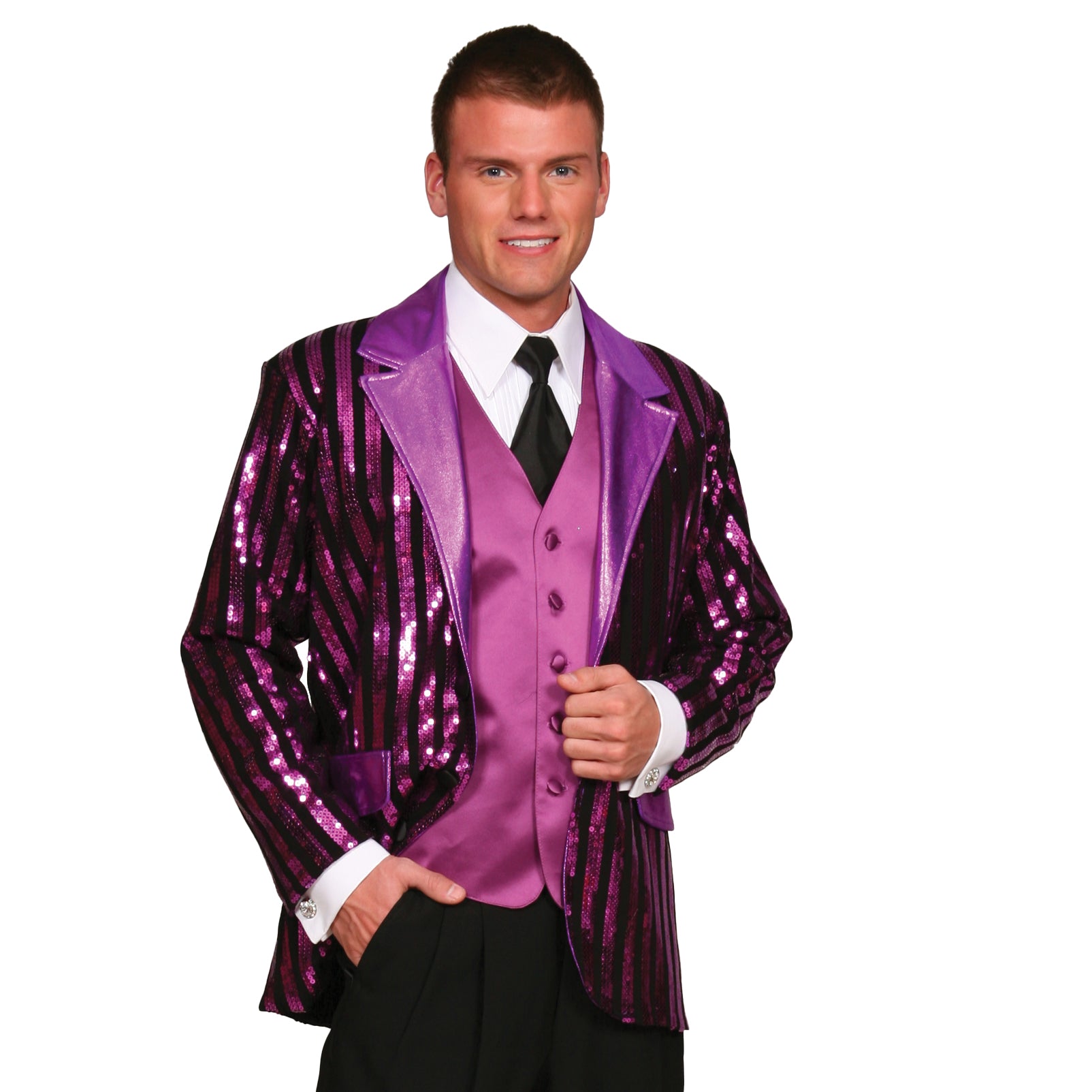 Satin-lined Sequin Stripe jacket is accented with metallic lycra lapels and pocket flaps. Satin coat buttons sold separately.