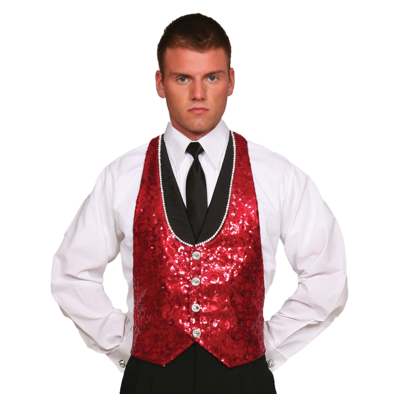 Bubble Sequin Mesh and metallic lycra lined backless vest is accented with satin lapels. Adjustable waist. Rhinestone trim and buttons sold separately.