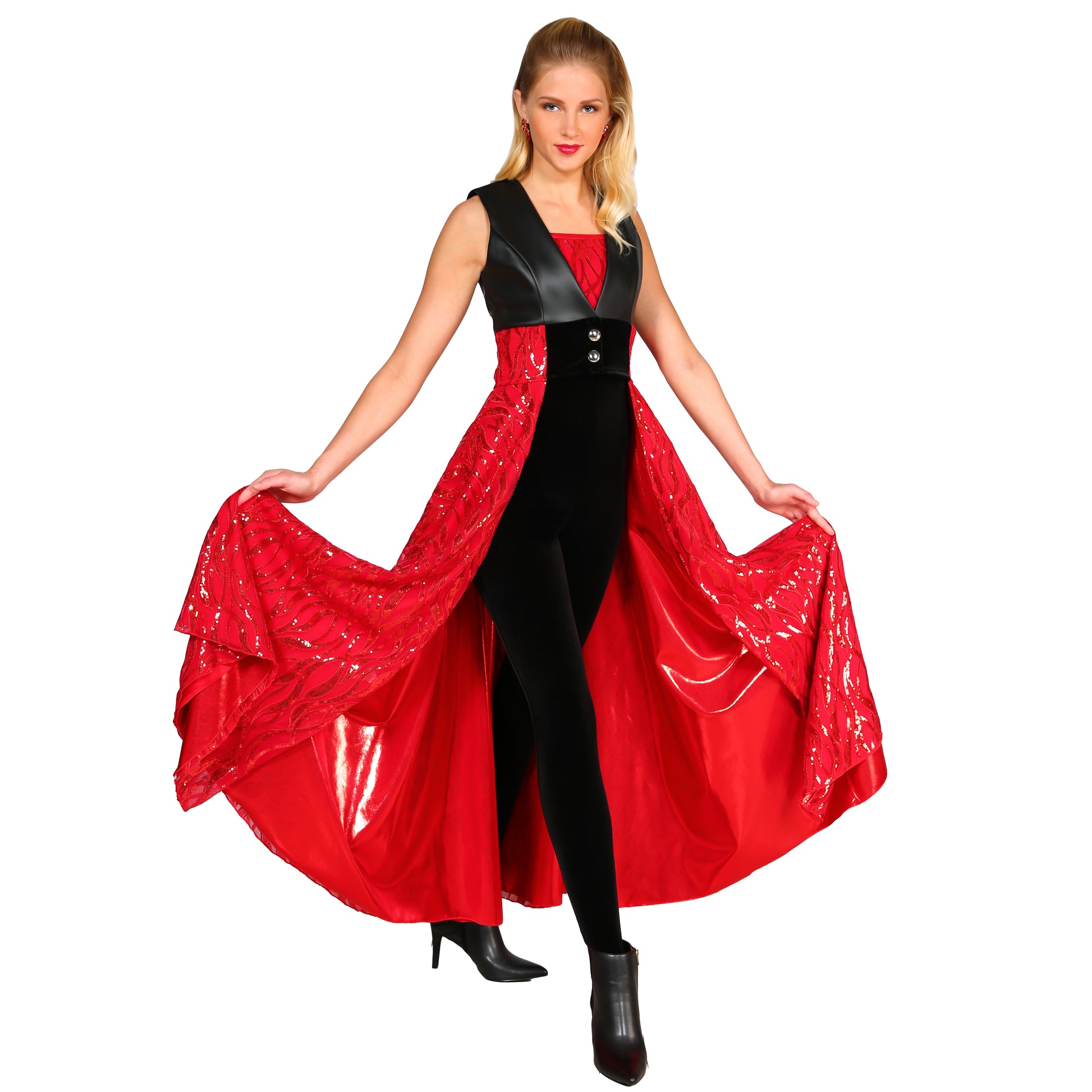 Faux leather vest with Admire Sequin and stretch velvet cummerbund. Attached Admire Sequin skirt lined with metallic lycra. Button detail accent.