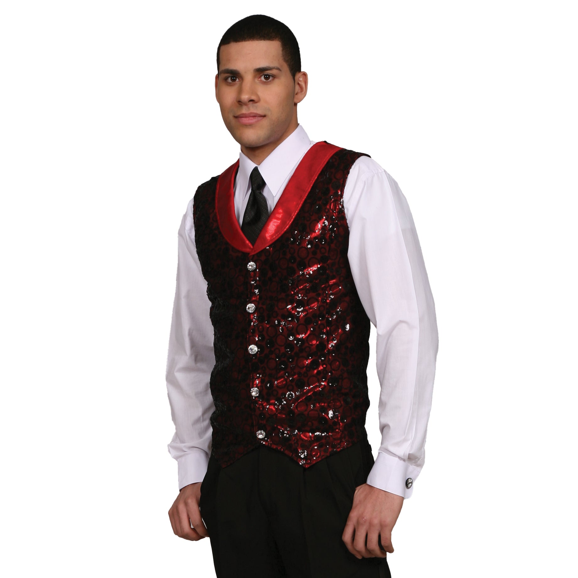 Bubble Sequin Mesh and metallic lycra vest has solid metallic lycra round lapels and a full back. Sequin and metallic finish are front only. Vest is fully lined. Rhinestone buttons sold separately.
