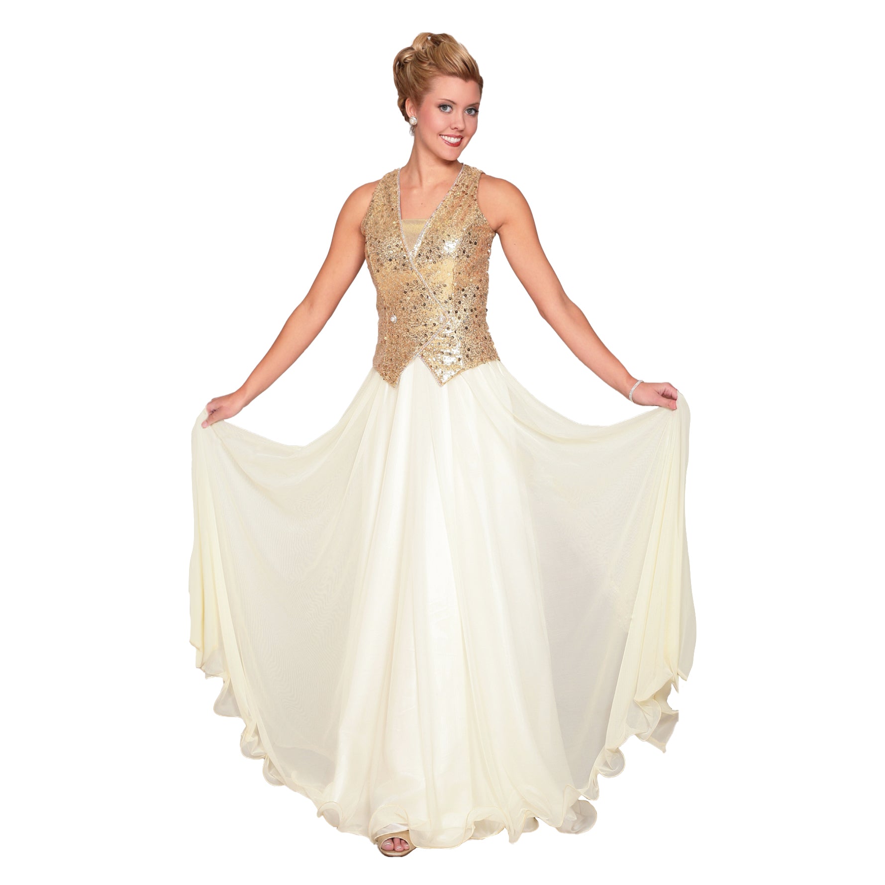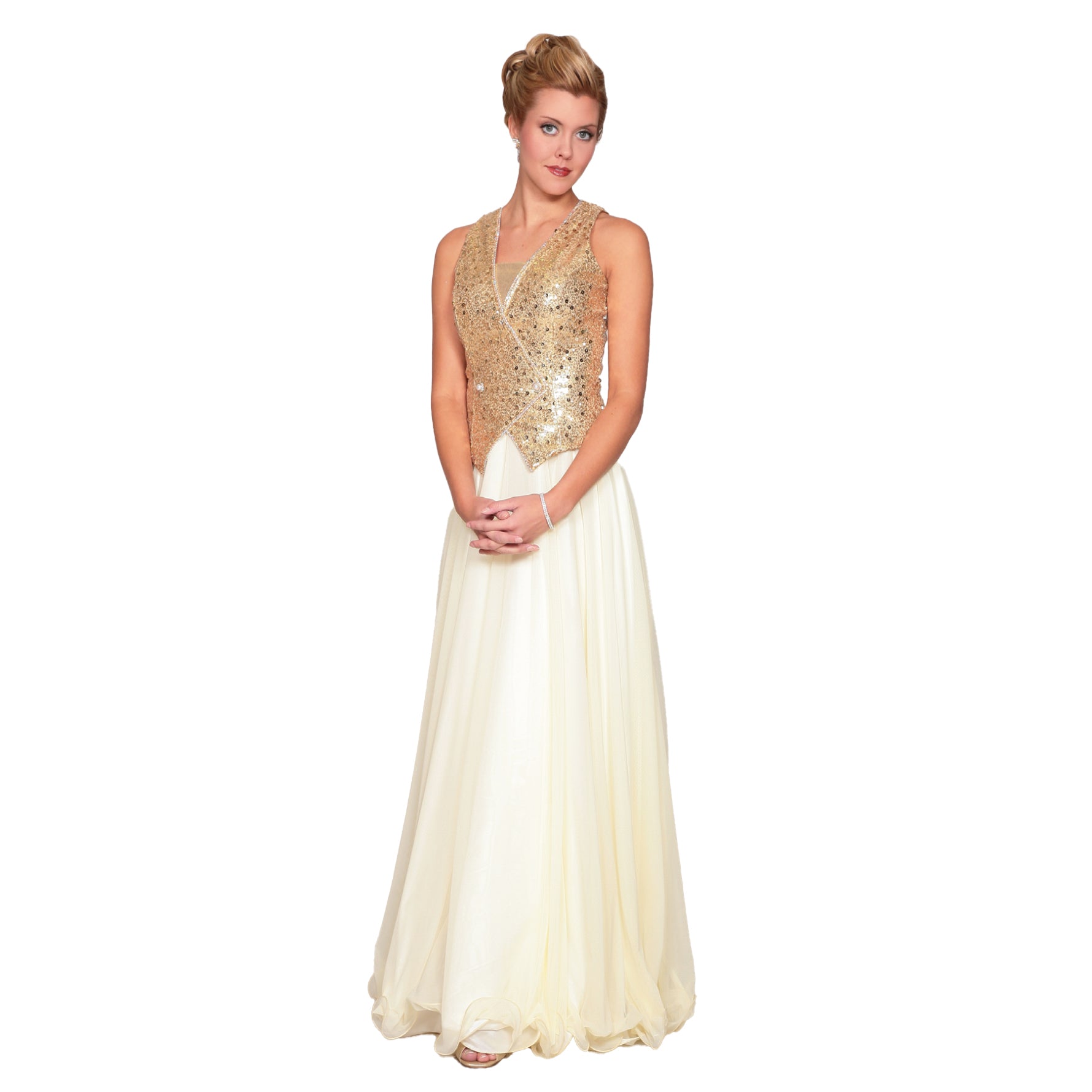 Metallic lycra criss-cross top has Multi Sequin overlay and metallic lycra inset. Rhinestone Trim and Pearl Rondel Button sold separately.
