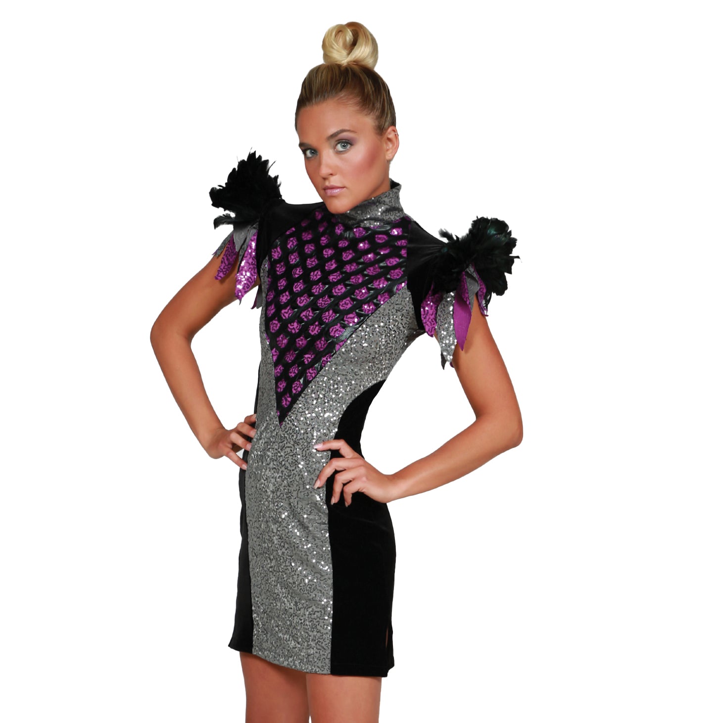 Sparkle Sequin pencil dress with laser cut mesh detail over Sparkle Sequin. Stretch velvet shoulder and side skirt accent. Knit tearaway skirt with stretch velvet waistband. Removable feather accents sold separately.