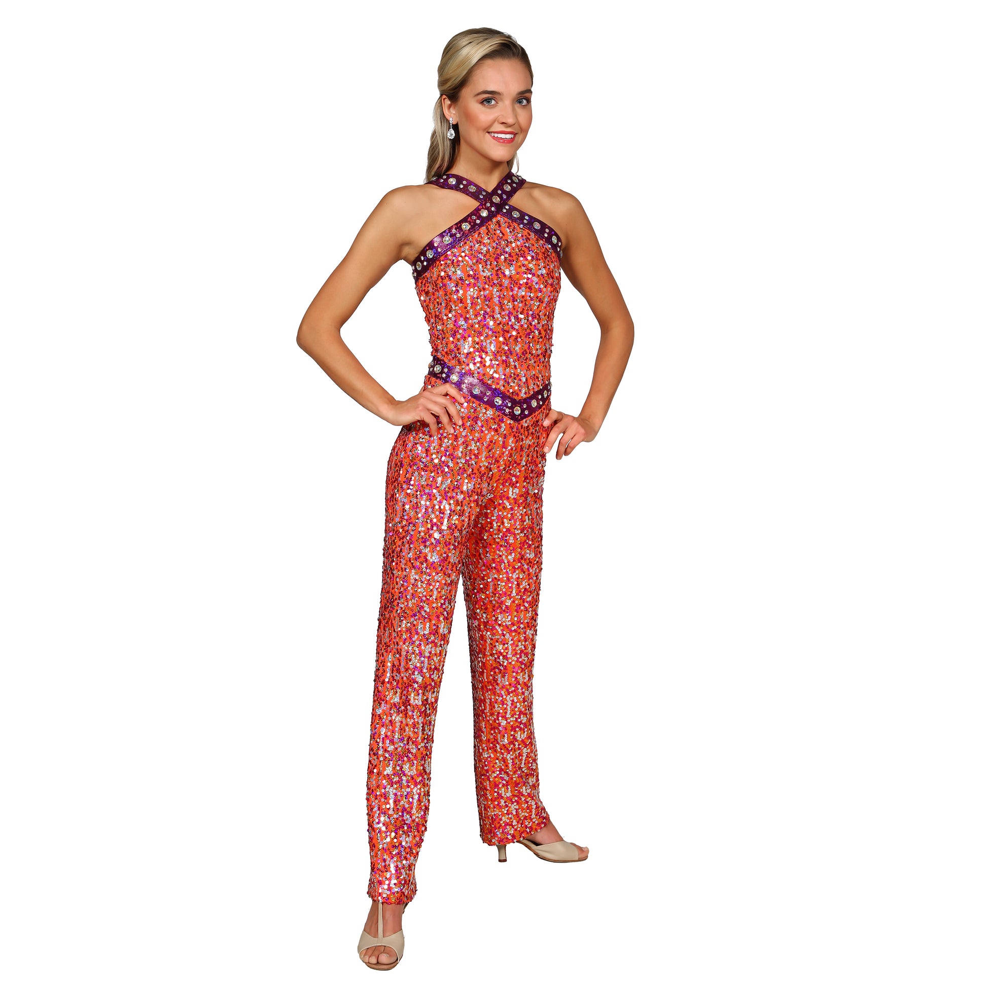 Multi-Color Sequin fully lined criss-cross neckline jumpsuit accented with shattered glass metallic lycra trim. Rhinestone detail sold separately.