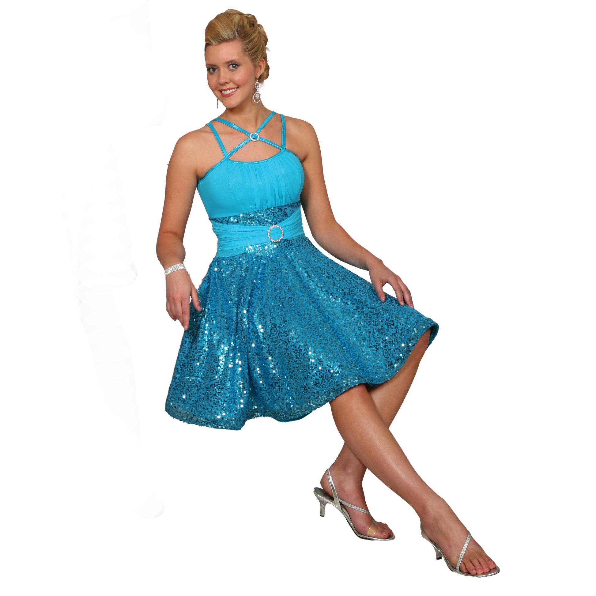 Square Sequin and metallic lycra dress features a bodice of solid stretch mesh and metallic lycra with shirred mesh detail at the waist. Straps and waist are accented with rhinestone buckles.