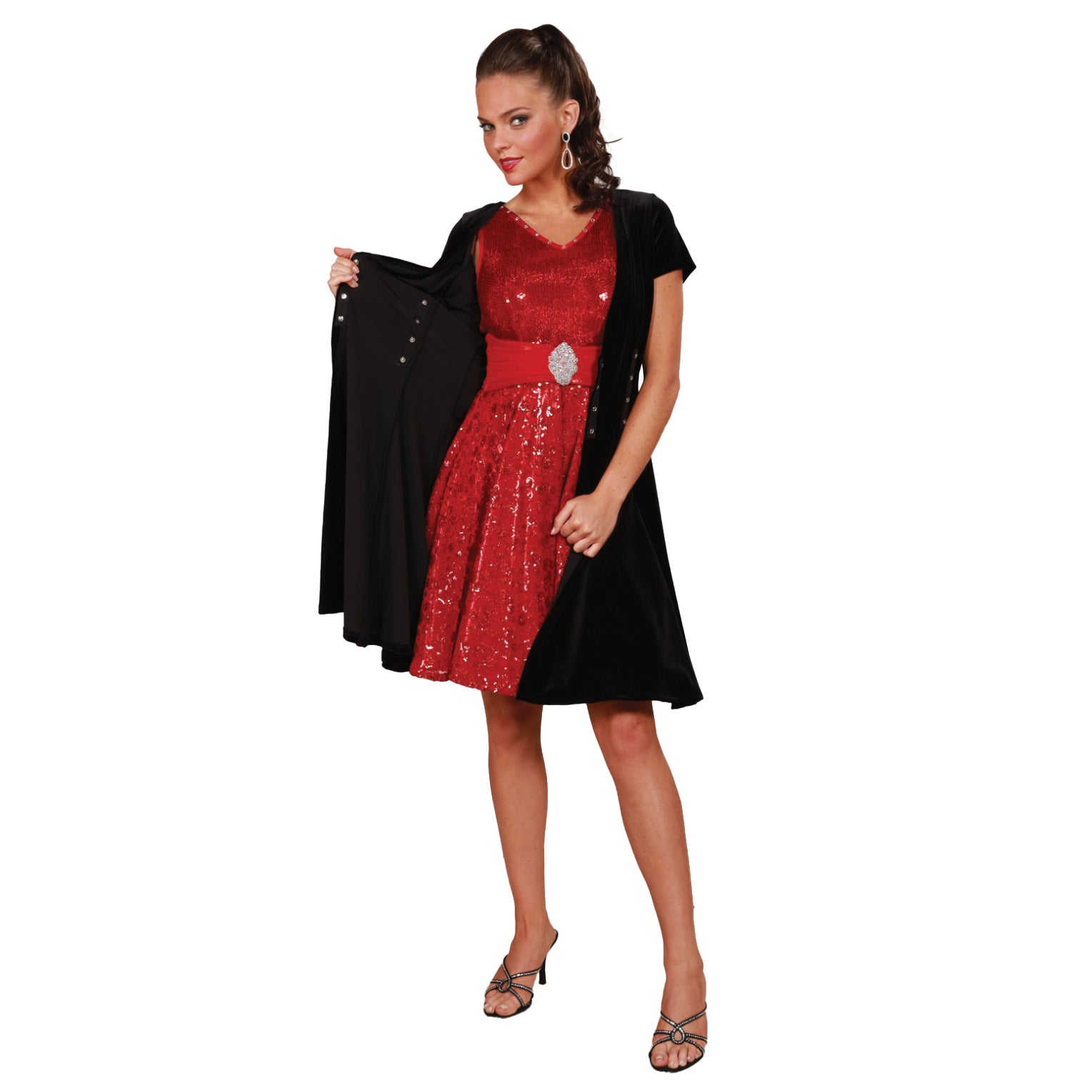 Stretch velvet cap sleeve dress with side snap tearaway feature.