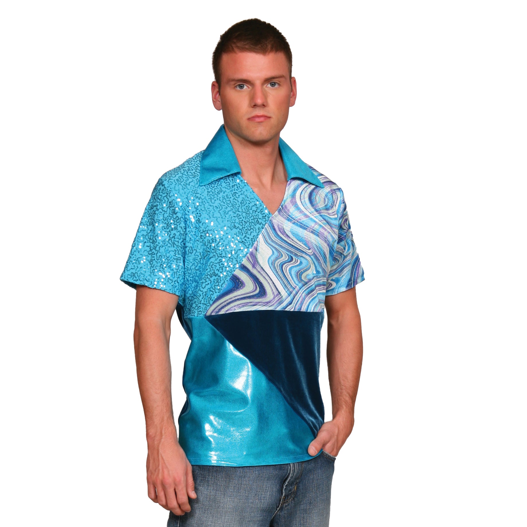 Sparkle Sequin, Stratosphere glitter velvet and metallic lycra asymmetrical front shirt has open collar and a solid stretch velvet back.