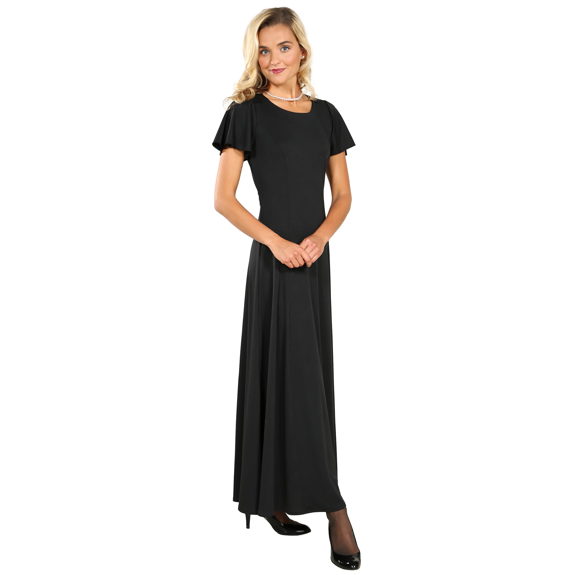 Knit pullover dress has long princess seams, rounded neckline and flutter sleeves. Dress is accented with waist ties for waistline adjustment. IN STOCK