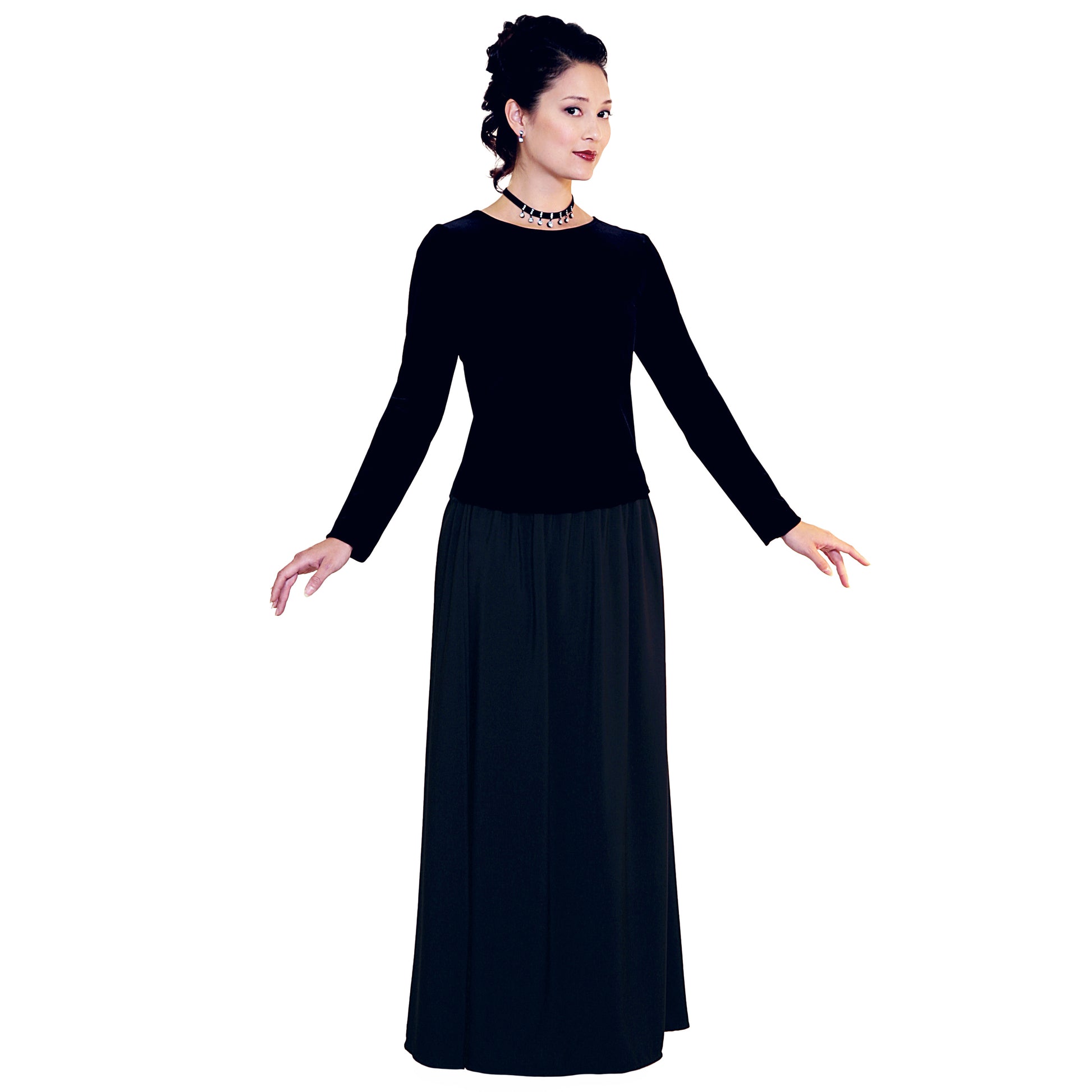 Faille pull-on skirt with elastic waistband and 90" bottom circumference. IN STOCK