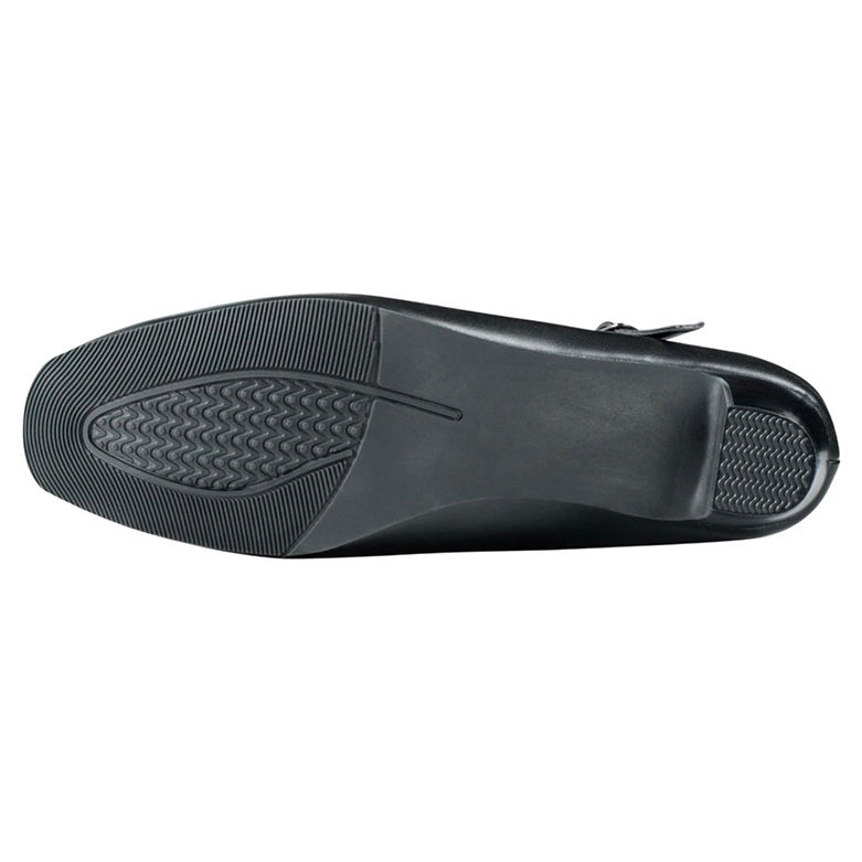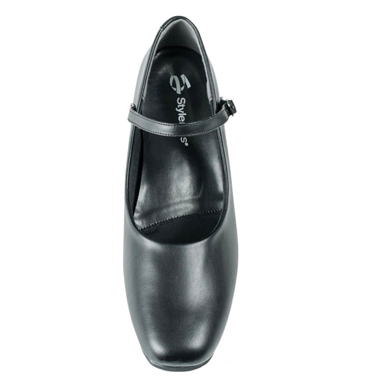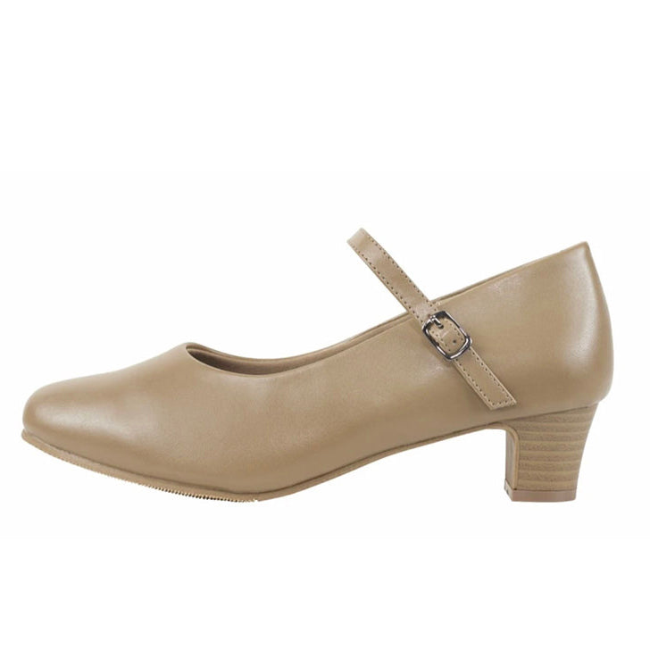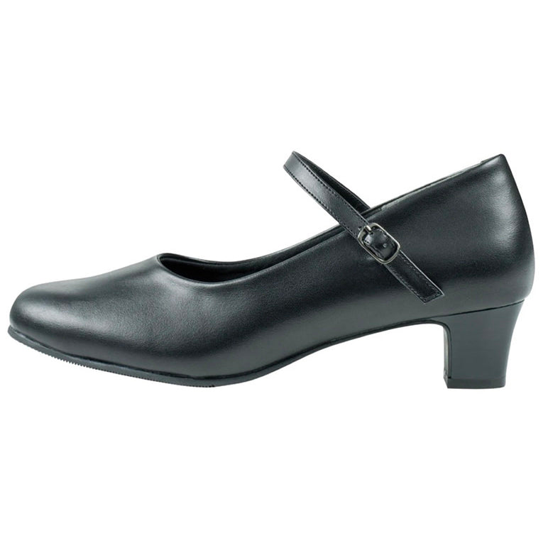 Soft vinyl upper character shoe with Cloud comfort innersole with 2" sturdy rubber heel. The non-marking rubber sole adds traction and comfort. Strap with buckle adds support.