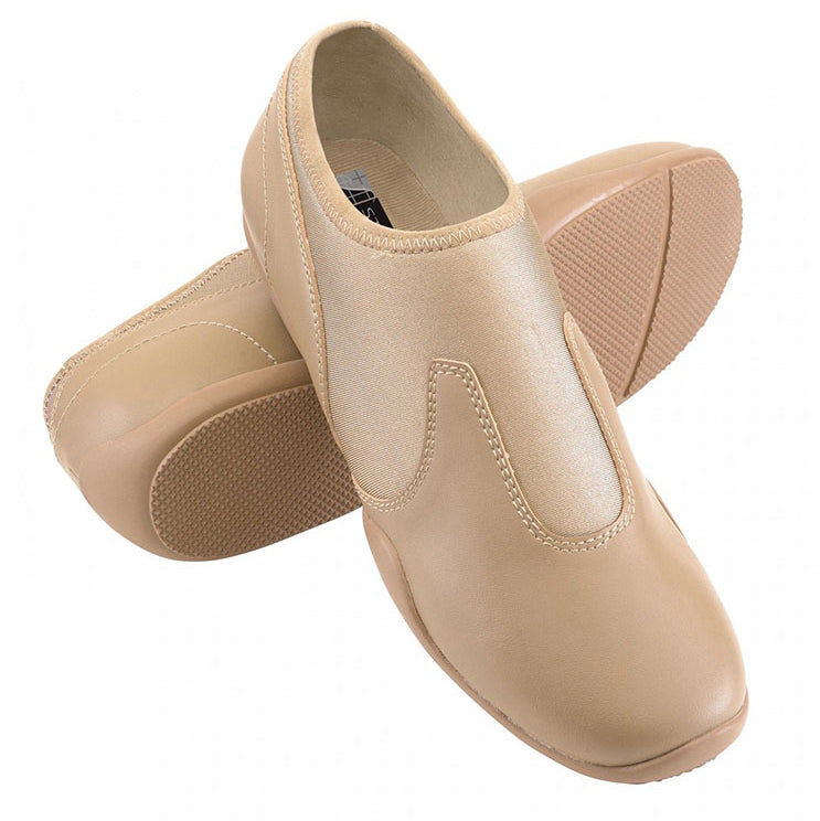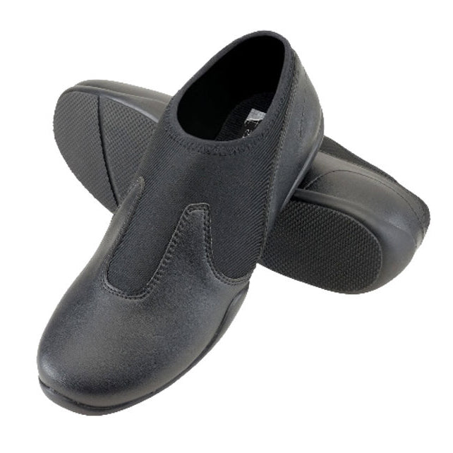 Split-sole vinyl dance shoe with Neoprene upper. The slip-on versatile shoe is safe for indoor and outdoor use.