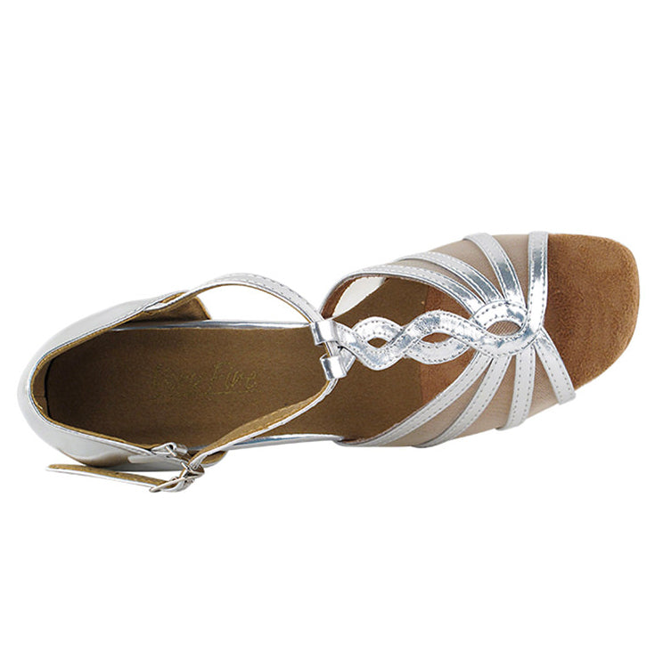 Silver Leather with tan mesh dance shoe with 2.5" heel. Quick-release buckling (buckle & clip/hook) and suede sole. Cushioned insole for shock absorption and comfort.